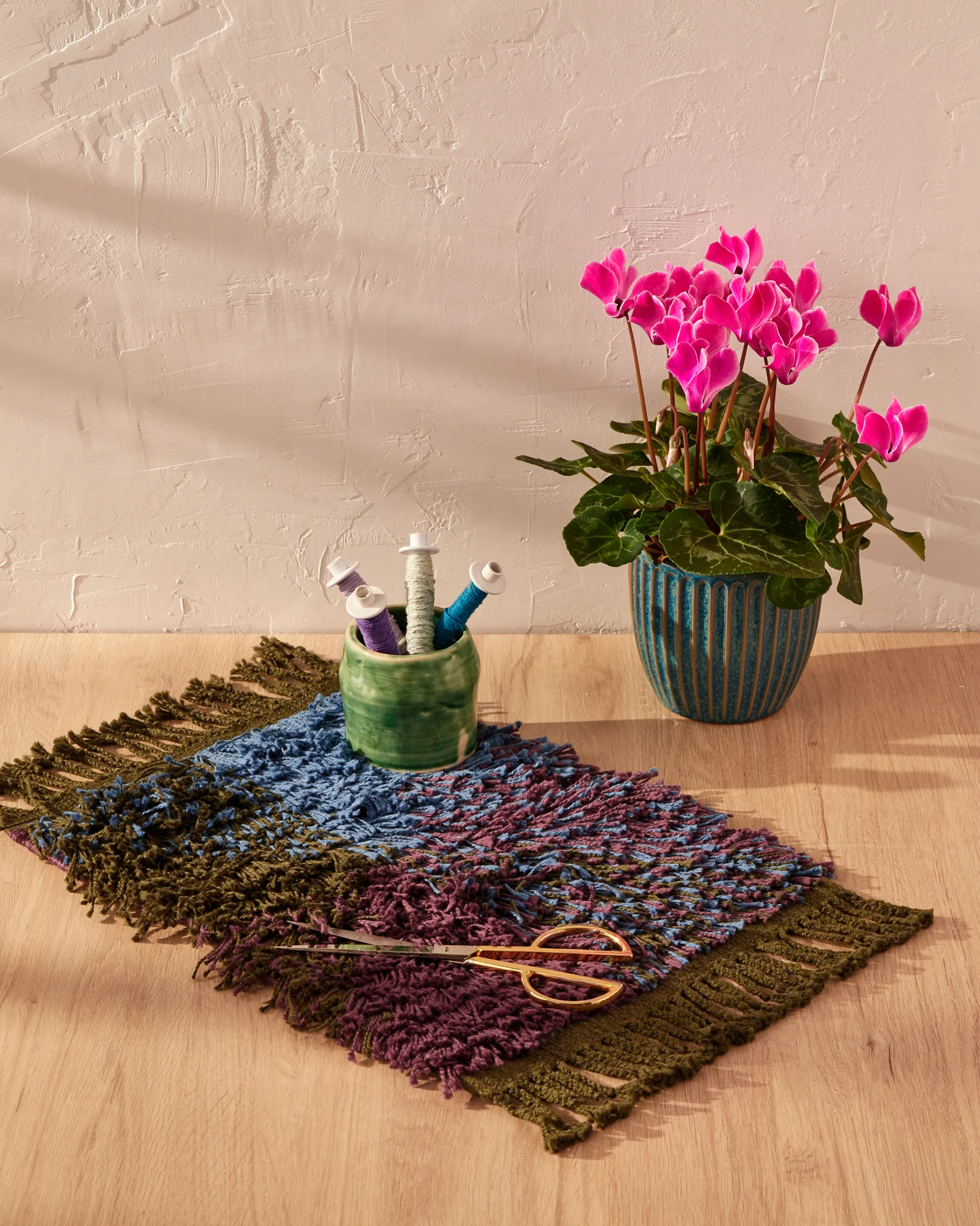 In 2024, North America experienced a total eclipse, an astrological event that brought ethereal wonder to many of our lives. This rug-style Rya takes inspiration from the event, combining darker valued colors in a cascading dusky spiral. This small project is an excellent place to learn about rug-style Ryas, or creating a strong sturdy textile with a thicker pile. Due to the limited yardage requirements for the Rya knots, this makes an excellent stash buster project. Order a kit.