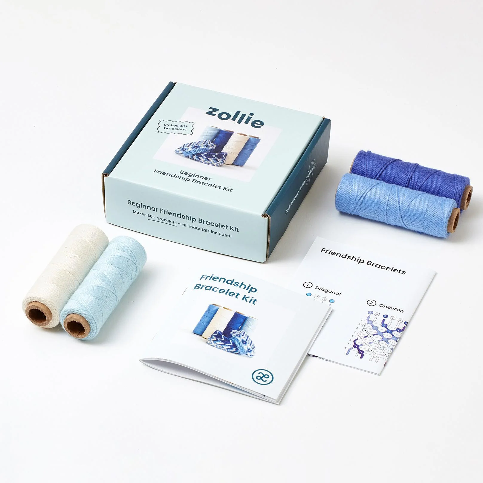 Create eye-catching friendship bracelets by turning simple knots into striking patterns. This kit is from our sister brand Zollie. It includes everything you need to make friendship bracelets, even as a complete beginner. Sharpen your skills and confidence by completing 3 bracelets, and then design your own! Suitable for ages 8+. Includes enough yarn for 30+ bracelets.Â